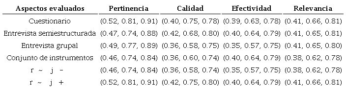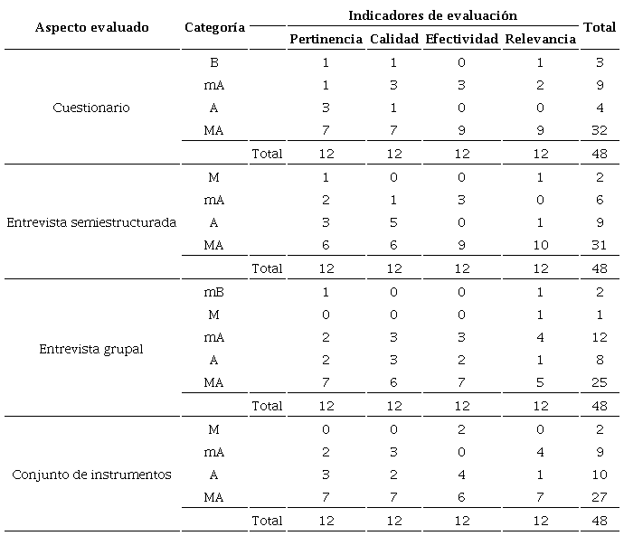 El diligenciado de la matriz evaluativa alcanzó un coeficiente de Cronbach fiable , conforme a la escala sugerida por Cohen et al. (2007). El conteo de las evaluaciones de cada aspecto evaluado (A1 = cuestionario, A2 = entrevista semiestructurada, A3 = entrevista grupal, y A4 = conjunto de instrumentos), conforme a los criterios prefijados (C1 = pertinencia, C2 = calidad, C3 = efectividad, y C4 = relevancia), permitió observar que la mayoría de estas se ubican entre las categorías de medianamente alto, alto y muy alto. Siguiendo la columna de los totales por categoría, las evaluaciones comprenden 95.83%, 95.83%, 93.75%, y 93.75% de las tres categorías superiores en la escala adoptada, respectivamente. Los resultados descriptivos aparecen descritos en la tabla 2. Las categorías con frecuencias completamente nulas han sido eliminadas.