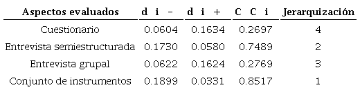Para el procesamiento de la información se implementó la técnica para la representación del ordenamiento por similitud respecto a la solución ideal, conocida como TOPSIS por sus siglas en inglés (Hwang y Yoon, 1981). En su versión clásica, esta técnica procesa información multicriterio para identificar la mejor solución a un problema, o bien para jerarquizar un conjunto preliminar de variantes de solución. El principio básico consiste en que la alternativa más adecuada muestra la menor distancia posible respecto a la solución ideal positiva, así como la mayor distancia posible respecto a la solución ideal negativa. Los aspectos a evaluar son cuatro: A1 = cuestionario, A2 = entrevista semiestructurada, A3 = entrevista grupal, y A4 = los tres instrumentos como conjunto, conforme a los cuatro criterios establecidos y en la escala lingüística prefijada.