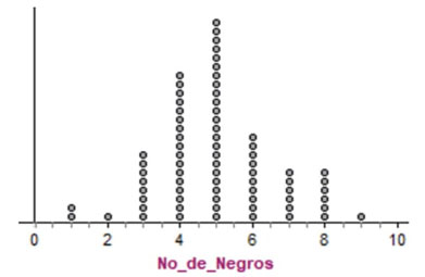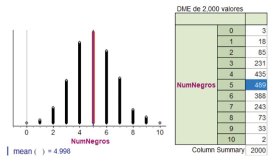 Arribado al punto en el que la DME se constituyó de 2,000 valores del estadístico, se solicitó a los estudiantes estimar la probabilidad de obtener el valor del estadístico igual a 5 cuadros negros en la muestra de 10. Para resolver la situación, los estudiantes podían volver a simular casi instantáneamente la DME a través de un comando simple que generaba una nueva colección de valores del estadístico del mismo tamaño; con este recurso los estudiantes podían apreciar la variabilidad entre distribuciones muestrales y brindar una mejor estimación de la probabilidad solicitada.