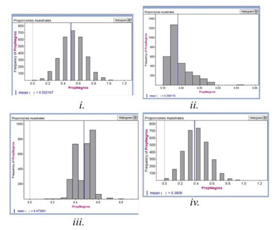 La resolución de la tarea no requiere del uso de simulaciones en Fathom sino del conocimiento de las propiedades básicas de la DME (que su centro se aproxima a la proporción poblacional y que es simétrica). La tarea continúa enmarcada en la exploración de un modelo de urna, donde la población a la que se hace referencia es ahora un conjunto grande de frijoles de dos tipos (pintos y negros). Al igual que en el estudio de Chance y colaboradores, con esta tarea pretendemos observar y analizar qué conocimientos y razonamientos desarrollaron los estudiantes con relación al concepto de DME.