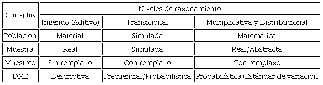 La definición de los niveles en el modelo de Chance et al. (2004) se describen en términos de conocimiento y comprensión de dichas propiedades y de las relaciones entre ellas. En cambio, nuestro modelo es más abstracto y menos descriptivo, pues solo contrastamos concepciones de esas nociones que marcan un avance: Población material vs. Matemática, Muestras reales vs. Abstractas y Muestreo sin remplazo vs. Con remplazo. Quizá estas diferencias no son tan cruciales en el nivel universitario, pero parecen importantes para que los estudiantes transiten a un concepto abstracto de distribución muestral.