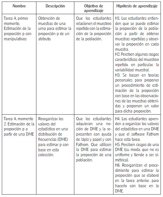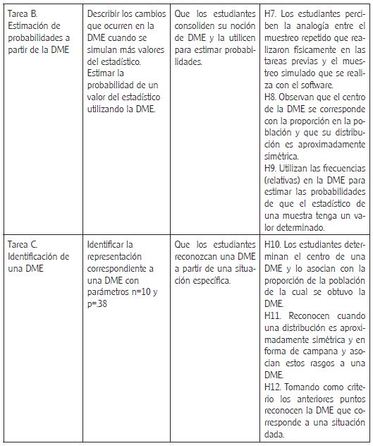 Las tareas que resolvieron los estudiantes fueron enmarcadas en una trayectoria hipotética de aprendizaje; la tabla 1 resume el conjunto de tareas, objetivos e hipótesis de aprendizaje correspondientes: