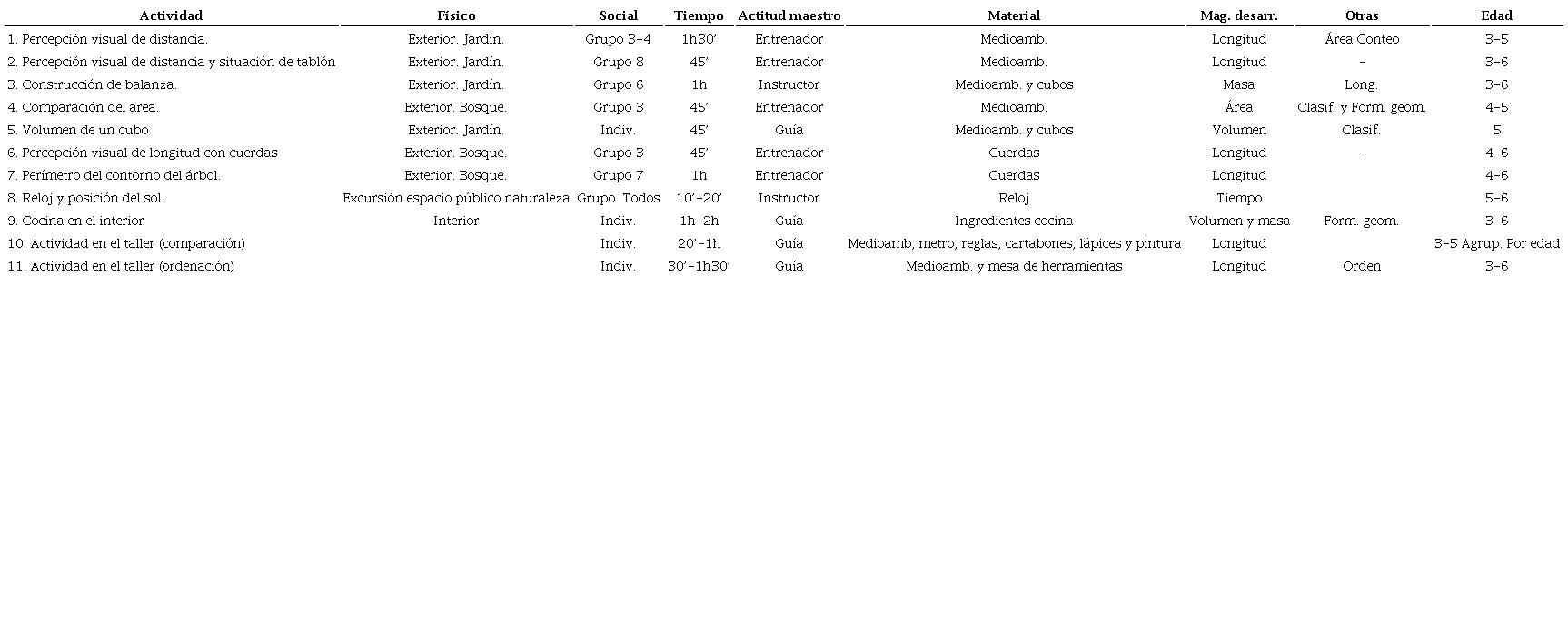 Entre todas las actividades observadas se describen y analizan aquellas focalizadas en los conceptos matemáticos asociados a las magnitudes: la longitud, la superficie, el volumen, la masa y el tiempo (Belmonte, 2005). En ocasiones, se trabajan otras nociones matemáticas de manera transversal, como son nociones vinculadas a la lógica, la aritmética y la geometría. Se ha considerado relevante recoger este tipo de información, por si esto involucrase otro tipo de actividades.