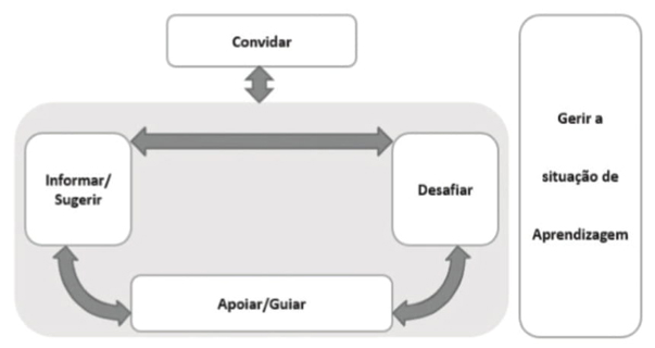 A parte mais escura da seta dupla que liga Guiar a Desafiar traduz uma característica importante da ação de Guiar, quando assume a forma de desafio em diferido, em que a professora solicita que os alunos explicitem desafios que colocou durante a fase de exploração da tarefa em pequenos grupos.
