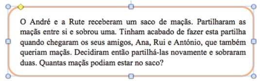Leonor, com 36 anos de experiência profissional, trabalhou em grupo durante a formação com uma colega de escola, com quem partilhou as decisões sobre a escolha das tarefas e sobre a sua planificação, aspetos que o par igualmente discutiu com as formadoras. No “Levar à prática I” este par selecionou a tarefa Chupa-chupas5, analisada durante a oficina de formação, optando por substituir o contexto de distribuir chupa-chupas por distribuir maçãs (Figura 2).
