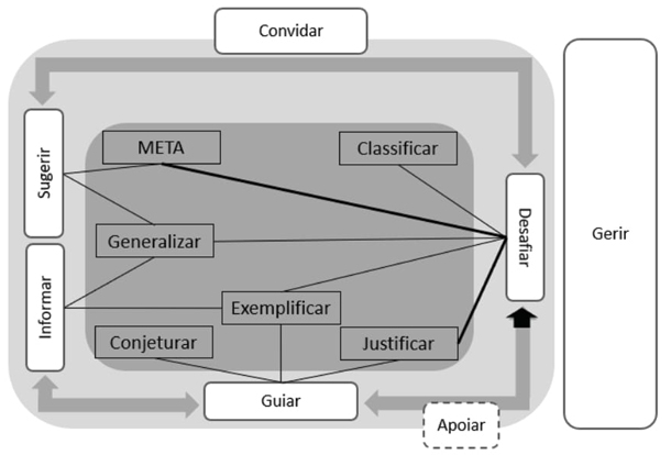Neste modelo, as ações do professor são organizadas em dois grupos distintos - as que se relacionam diretamente com os tópicos e processos matemáticos e as que se focam na gestão da aprendizagem (Ponte et al., 2013). É dado especial relevo às ações do primeiro grupo, que os autores designam por Convidar, Apoiar/Guiar, Desafiar e Informar/Sugerir. As ações de Convidar promovem o envolvimento inicial dos alunos na discussão ou num seu segmento (Ponte et al., 2013), incentivando os alunos a participar e a partilhar as suas resoluções (Mata-Pereira e Ponte, 2018a). As ações de Apoiar/Guiar incentivam a continuação da participação dos alunos na discussão (Ponte et al., 2013), conduzindo-os a apresentar informação (Mata-Pereira e Ponte, 2018a). Informar/Sugerir corresponde a ações em que é o próprio professor que introduz informação, sugere argumentos, ou valida respostas dos alunos (Ponte et al., 2013). Já nas ações de Desafiar, a intenção do professor é que sejam os alunos a assumir esse papel, incentivando-os a ir além do seu conhecimento prévio (Mata-Pereira e Ponte, 2018a). Este tipo de ações “coloca o aluno na situação de ser ele próprio a avançar em terreno novo, seja em termos de representações, da interpretação de enunciados, do estabelecimento de conexões, ou de raciocinar, argumentar ou avaliar” (Ponte et al., 2013, p. 59).