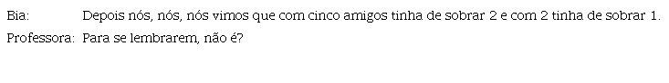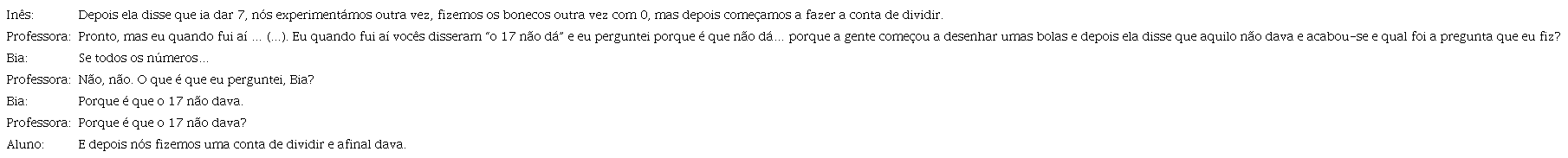 Salientar ou validar uma ideia a partir do que os alunos fizeram ou disseram é outra intenção subjacente à ação de Informar. No excerto seguinte, Leonor reforça uma propriedade dos “não exemplos”, ou seja, dos números que não satisfazem as condições do enunciado (o número de maçãs não pode ser divisível pelo número de pessoas).