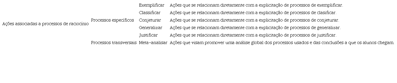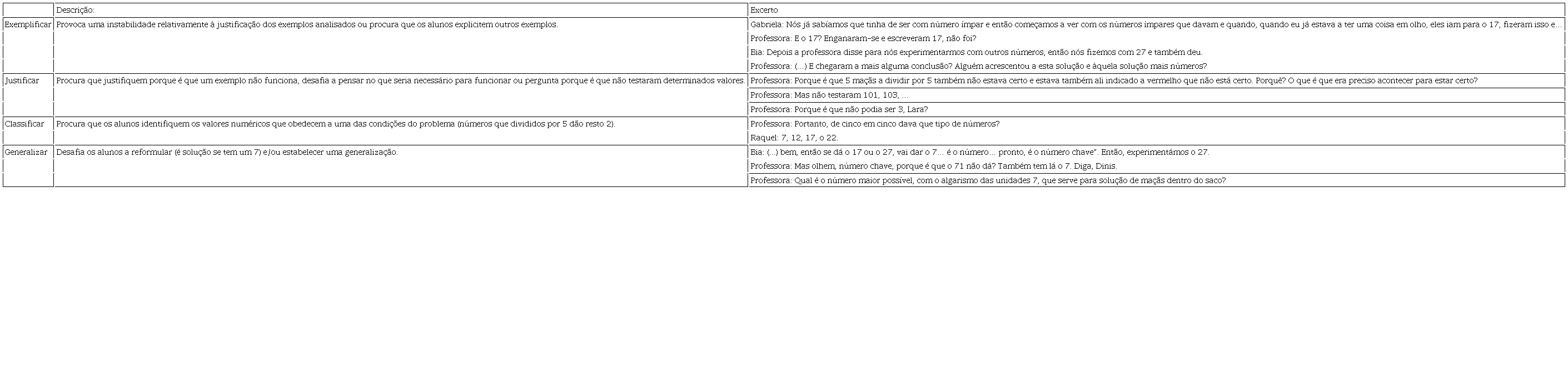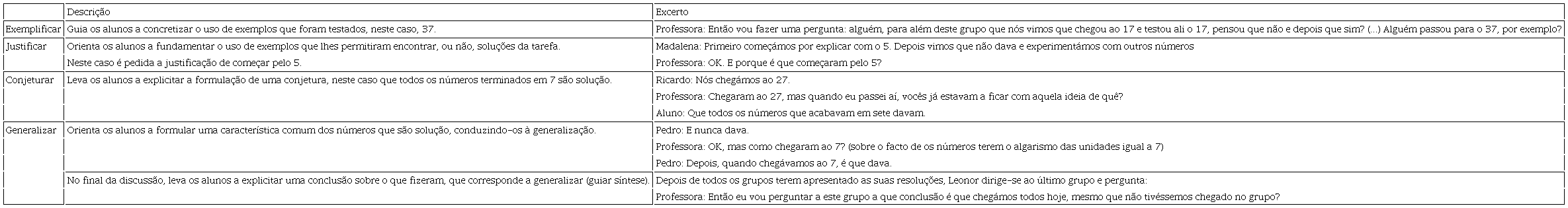 O quadro 5 descreve estas ações relacionadas com processos de raciocínio (exemplificar, justificar, conjeturar e generalizar) e ilustra-as recorrendo a excertos ocorridos durante a discussão da tarefa