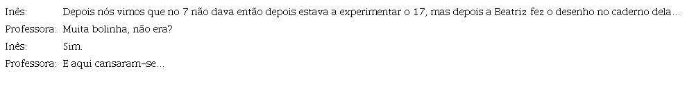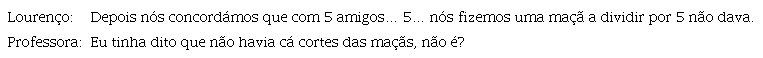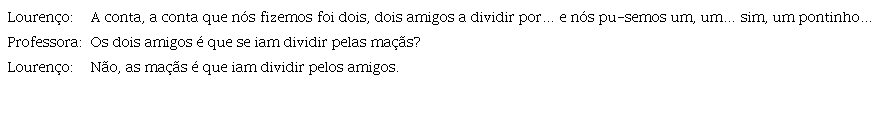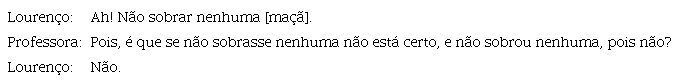 Envolve, também, a correção ou inibição de caminhos de resolução que resultam de interpretações incorretas do enunciado da tarefa, tal como acontece quando Leonor chama a atenção para a impossibilidade de se considerarem cortes nas maçãs: