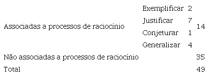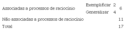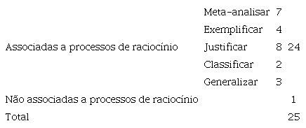 A análise de todas as ações de Leonor durante a discussão coletiva permite identificar a frequência observada em cada uma das categorias identificadas, distinguindo as ações em que foi observada uma associação a processos de raciocínio das que, pelas suas características, não o podem estar (tabela 5).