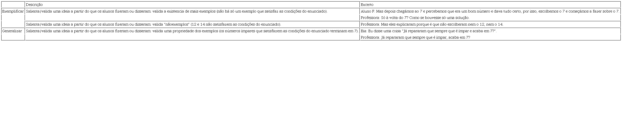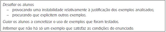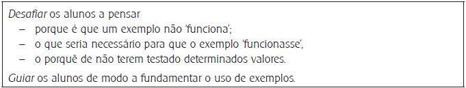 As ações da professora focadas em Exemplificar (Quadro 11) visam a análise crítica do uso de exemplos, quer provocando instabilidade sobre se eles podem ou não ser considerados exemplos, quer procurando a explicitação de mais exemplos e o seu uso para avançar na resolução do problema. Este último aspeto é fundamental pois é nele que reside a essência de considerar a exemplificação como um processo (auxiliar) de raciocínio.