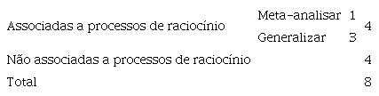 Identificamos um processo de raciocínio não referido na literatura, Meta-analisar, que corresponde a um nível de pensamento em que os objetos são os processos de raciocínio e sobre o qual importa que o professor foque algumas das suas ações. Meta-analisar corresponde a fazer uma abstração e pensar sobre características, por exemplo, de conjeturar ou generalizar.