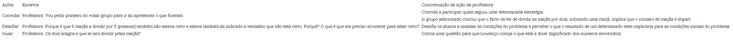 A segunda fase de análise incidiu sobre o relato, que foi analisado tendo como base o modelo de Ponte et al. (2013) e Mata-Pereira e Ponte (2017, 2018a, 2018b) de modo a associar as intervenções da professora a um tipo de ações consideradas por estes autores. Deste modo, as intervenções da professora que integravam o relato foram associadas à ação que ela ilustra e foi incluída uma descrição que justifica a associação realizada. Diversos exemplos são apresentados no Quadro 1.