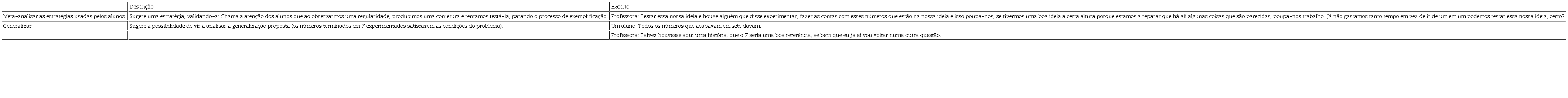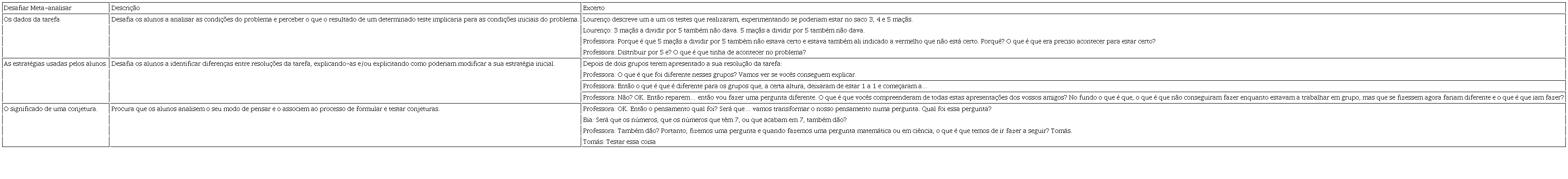 A análise de dados permite destacar uma categoria de processos matemáticos que designamos por Meta-analisar, não associada a um determinado processo de raciocínio, mas claramente focada no raciocínio matemático. Esta categoría é identificada, sobretudo, na ação de Desafiar, mas também ocorre em Sugerir. Envolve a reflexão sobre estratégias gerais de resolver um problema ou de con-duzir uma investigação matemática (Quadro 8).