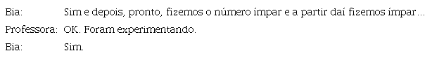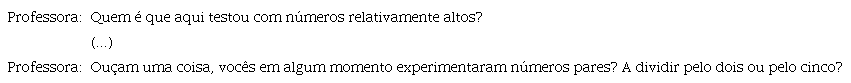 O primeiro excerto ilustra um convite à participação dos alunos que testaram números com determinadas características, neste caso, números pares, enquanto o segundo exemplifica um apelo à intervenção daqueles que experimentaram números com uma certa ‘grandeza’.