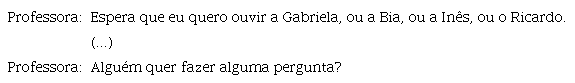 É de salientar que nem sempre é evidente ou explícita uma intenção da professora relacionada com a Matemática quando convida alunos a participar na discussão. Identificam-se sete deste tipo de ações cuja intenção é gerir as intervenções dos alunos na discussão, quer dando voz especificamente a alguns deles quer solicitando globalmente a participação dos alunos da turma na discussão. São exemplos destas ações as seguintes intervenções de Leonor: