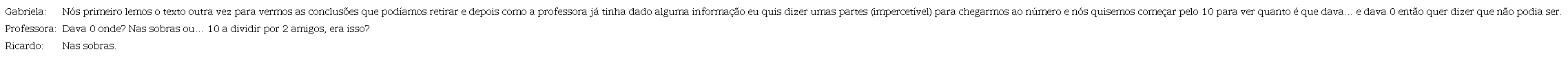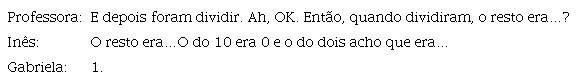 A questão colocada por Leonor leva Ricardo, um aluno do mesmo grupo, a clarificar a afirmação de Gabriela sobre o significado da expressão “dava 0”. A preocupação de incentivar a explicitar e, por vezes, de corrigir afirmações dos alunos, aparece, também associada à ação de Guiar: