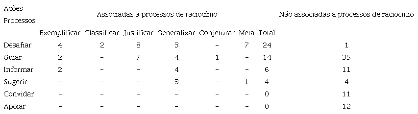 Nesta fase de análise de dados foi também contabilizado o número de ações da professora incluídas em cada uma das categorias consideradas. Na secção relativa à análise de dados a ordem pela qual são apresentadas as ações da professora está associada à sua expressão nos processos de raciocínio que apoia e promove.