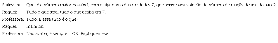 O desafio “expliquem-se” surge aqui como um convite para concretizar a resposta a uma questão e culmina um segmento de perguntas a que os alunos iam dando respostas imprecisas, mas que tinham como intenção compreender que não podiam indicar o maior número possível de maçãs.