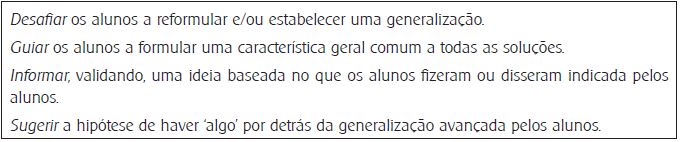 Associado a Generalizar (Quadro 10) salientamos o desafio para reformular ou avançar com uma generalização e a sugestão de análise de um padrão.