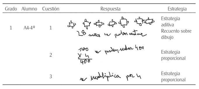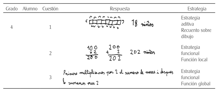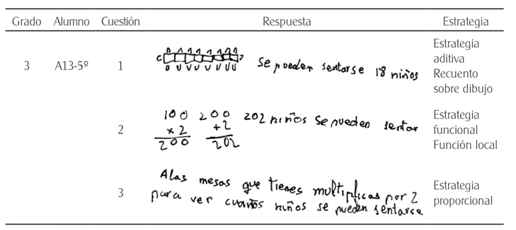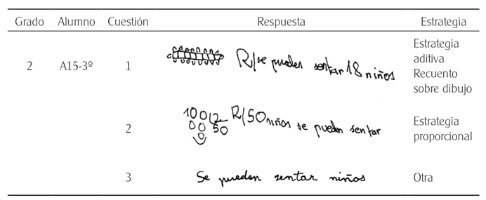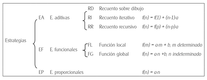Las estrategias aditivas se dividen en (1) recuento sobre el dibujo, si el alumno dibuja el término pedido y cuenta sus elementos, (2) recuento iterativo, si parte del primer término y suma la diferencia constante, o patrón de crecimiento, hasta llegar al término pedido y (3) recuento recursivo, si parte de un determinado término y suma la diferencia constante hasta llegar al término requerido. Las estrategias funcionales pueden ser (1) locales, si el alumno utiliza una función para hallar los elementos de un determinado término y (2) globales, si utiliza una función para hallar los elementos de un término cualquiera. Y en las estrategias proporcionales, el alumno utiliza erróneamente, la proporcionalidad directa (tabla 2).