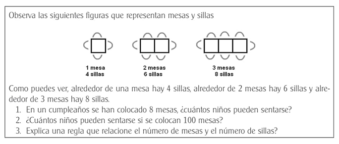 Para resolver la primera cuestión, el alumno debe descubrir el patrón de crecimiento, “añadir dos sillas”, para realizar la generalización cercana; en la segunda cuestión debe extender el rango del patrón hasta las 100 mesas, para realizar la generalización lejana; y en la tercera cuestión debe expresar una regla que permita hallar el número de sillas que se colocan alrededor de un número cualquiera de mesas.