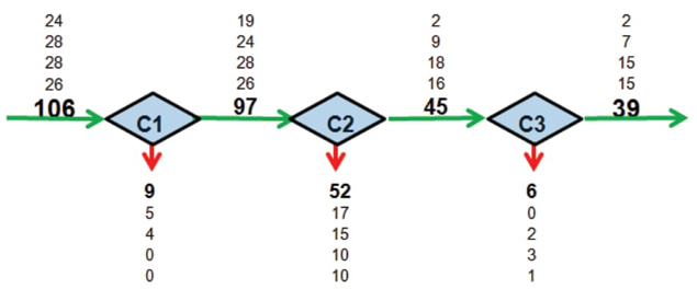 En el diagrama de flujo de la figura 3 se observa que las tres cuestiones están ordenadas por complejidad, de forma que no hay saltos entre cuestiones. De los 106 alumnos 97 realizaron correctamente la generalización cercana, de ellos 45 realizaron correctamente la generalización lejana y de estos expresaron correctamente la regla general.