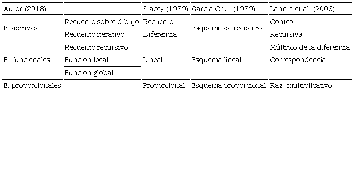 Las estrategias son los métodos para resolver problemas, “y suponen cualquier tipo de procedimiento que pueda ejecutarse, teniendo en cuenta las relaciones y los conceptos implicados (Rico, 1997, p. 31). Stacey (1989) observó cuatro estrategias distintas: recuento, diferencia entre términos consecutivos, función lineal y proporcionalidad directa. García Cruz (1989) estableció tres estrategias: esquema de recuento, esquema lineal y esquema de proporcionalidad directa. Lannin et al. (2006) definieron cinco estrategias: conteo, recursiva, múltiplo de la diferencia, razonamiento multiplicativo y correspondencia. Zapatera (2018), recopiló estas estrategias en tres grandes grupos: estrategias aditivas, estrategias funcionales y estrategias proporcionales (tabla 1).
