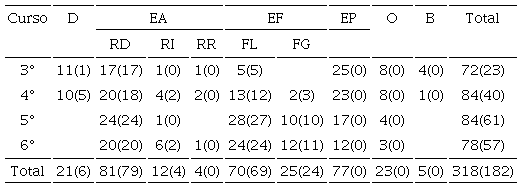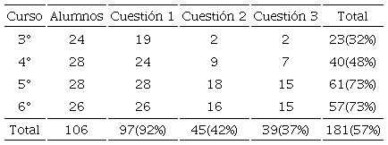En la tabla 3 se observa que 57% de las respuestas son correctas y que el nivel de éxito incrementa al aumentar el curso y disminuye al aumentar la complejidad de las cuestiones.
