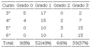Todos los estudiantes que expresaron la regla, habían realizado previamente la generalización lejana, y todos los que habían realizado la generalización lejana también habían conseguido la generalización cercana. Esto nos permite establecer cuatro grados o estadios de desarrollo bien diferenciados: en el grado cero estarían los 9 alumnos que no resuelven bien la primera cuestión; en el grado 1, los 52 que solo resuelven la generalización cercana; en el grado 2 los 6 que resuelven bien las dos generalizaciones; y en el grado 3, los 39 que resuelven correctamente las tres cuestiones (tabla 4).