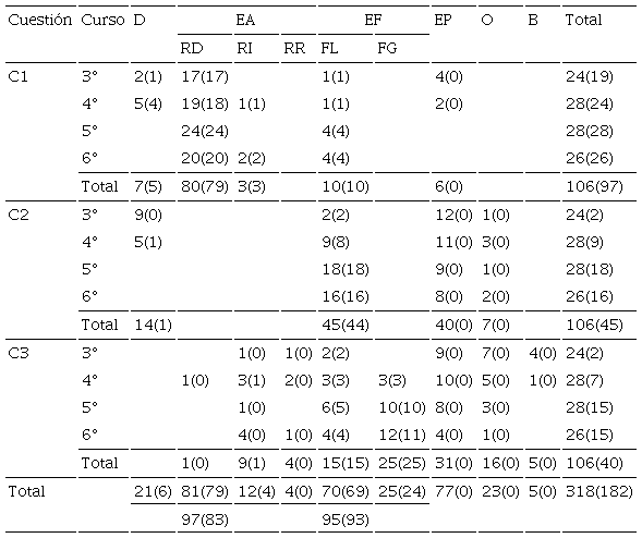 En la tabla 5 se muestran las estrategias usadas por los alumnos de cada curso en cada una de las tres cuestiones y entre paréntesis las respuestas correctas en cada caso.