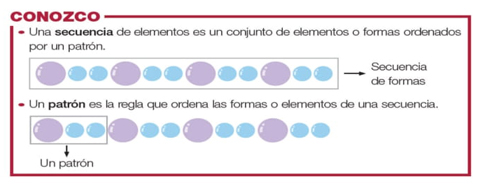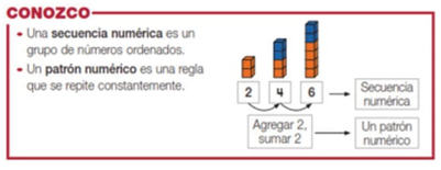 Proposiciones. Se presentan en las secciones Conozco y practico. Aparecen mediante lenguaje natural, y se asocian con aspectos referentes a la resolución de ecuaciones o inecuaciones, así como con la identificación de patrones. Un ejemplo asociado a la identificación de patrones es “cuando la diferencia entre 2 números consecutivos de una secuencia numérica no es siempre la misma, puedes identificar un patrón de multiplicación o división” (Rodríguez et al., 2018, p. 97).
