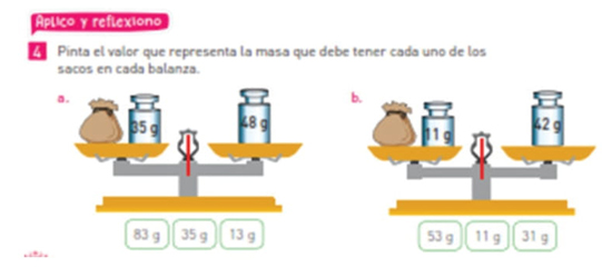 Lenguaje. Se identifica el uso de los lenguajes numérico, verbal, tabular, e icónico. En las tareas de estructura donde se pide identificar o hacer uso de propiedades, los lenguajes numérico y verbal son los predominantes; por otra parte, las prácticas asociadas a SP10, SP11 y SP12 (ver tabla 3) se realizan principalmente a través de los lenguajes numérico y tabular. Las prácticas asociadas a las SP13 y SP14 se trabajan a través de lenguaje icónico (uso de balanzas) y se comienza a hacer uso de símbolos o letras (como x, y y z) para designar lo desconocido, definiéndolos como incógnitas.