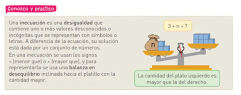 Definiciones-conceptos. Estos objetos matemáticos se encuentran en las secciones Glosario y Conozco y practico. Se presentan mediante lenguaje natural apoyados por representaciones de tipo simbólico-literal, tablas e iconos que permiten ejemplificarlas. Entre las definiciones se encuentran: ecuación, incógnita, modelar, operación inversa, patrón numérico, secuencia, valor encontrado, inecuación, balanza en desequilibrio, conjunto de números como solución. La figura 12 presenta la definición de inecuación.