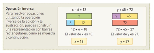 Definiciones-conceptos. Se presentan en los apartados de Glosario y Conozco y practico, generalmente mediante lenguaje natural, con apoyo en el uso de ejemplos (tablas, algoritmos, figuras, etc.). Entre las definiciones o conceptos asociados a las prácticas de SP1, se encuentran las propiedades del 0 y el 1 en la multiplicación y división, y la propiedad distributiva. Para las tareas propias del eje Pya (ver tabla 3, números 10, 11 y 12), las prácticas matemáticas movilizan los conceptos de patrón numérico de adición, patrón numérico de sustracción, patrón numérico de multiplicación, patrón numérico de división, secuencia numérica, secuencia de figuras, crecimiento, disminución. Para las prácticas de las SP13 y SP14, los conceptos que se identifican son ecuación, incógnita, símbolo o letra (x, p, r, ℯ, etc.), modelar, balanza equilibrada, operación inversa, lados izquierdo y derecho de la ecuación.