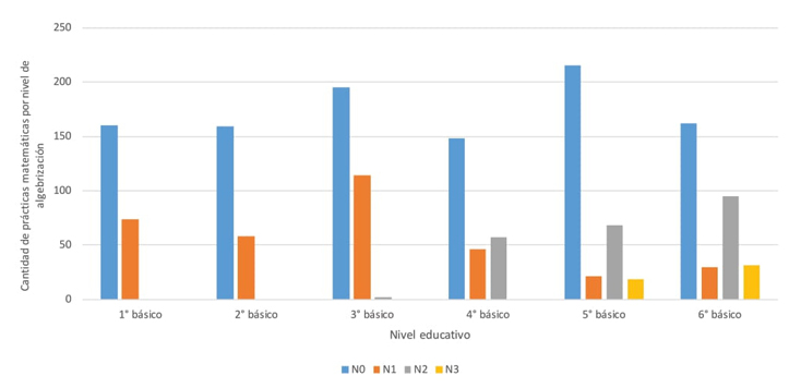 Además, se ha observado que un tipo de problema admite una o más prácticas matemáticas de referencia, las cuales pueden ser catalogadas en un Nivel u otro de Algebrización. Con esto se reafirma lo señalado por Godino y colaboradores (2014), “el nivel se asigna, no a la tarea en sí misma, sino a la actividad matemática que se realiza, por lo que dependiendo de la manera en que se resuelve una tarea, la actividad matemática puede ser clasificada en un nivel u otro” (p. 206). Si bien se ha identificado que el currículo de educación básica en Chile promueve prácticas matemáticas en Niveles consolidados de Algebrización, en la figura 16 se observa la poca presencia de este tipo de prácticas y el gran desequilibrio que existe entre el Nivel 0 y el resto de los Niveles de Algebrización.