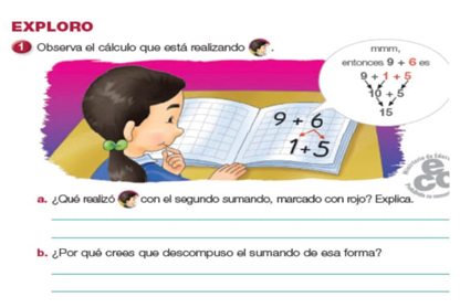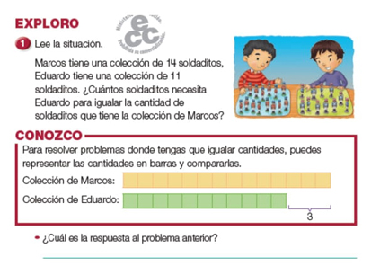 Procedimientos. Los procedimientos son de naturaleza aritmética. Para obtener un valor desconocido, por ejemplo 5 + 4 = ⎕, se sugiere hacer uso de una cinta numerada y comenzar a contar, para este caso comenzando del 5 y contar 4 hacia adelante. La acción de contar es una técnica que prevalece a lo largo del libro de texto (contar los elementos en colecciones) para establecer la cardinalidad de los conjuntos, o bien, para comparar colecciones de elementos.