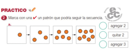 Lenguaje. Los patrones, secuencias y ecuaciones, se representan principalmente mediante lenguaje icónico, numérico y lenguaje natural. Los patrones y secuencias pueden encontrarse a partir de representaciones icónicas o bien representadas mediante lenguaje numérico (ver figura 4). Por otra parte, la idea de ecuación (de manera implícita) comienza a introducirse a través de representaciones icónicas, principalmente usando el concepto de balanza.