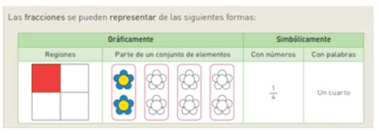 Lenguaje. Predomina el lenguaje numérico (cantidades hasta el 10,000), apoyado de rectas numéricas y tablas de valor posicional, bloques multibase, entre otros. Las fracciones (propias e impropias) se representan en la recta numérica, y por medio de lenguaje gráfico, simbólico, como la parte de un todo y mediante lenguaje natural (ver figura 7). Los números decimales se encuentran en forma numérica y apoyados por representaciones gráficas (por ejemplo, en regiones).
