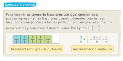 Argumentos. Los argumentos también se encuentran en los apartados de Conozco y practico. Se enuncian como ejemplos apoyados en figuras o procedimientos de carácter pictórico. En la figura 9, el argumento que valida el procedimiento corresponde al enunciado “puedes representar las fracciones usando diferentes colores, y el resultado corresponderá a todo lo pintado”. Además, la observación es una de las principales actividades utilizada para argumentar.