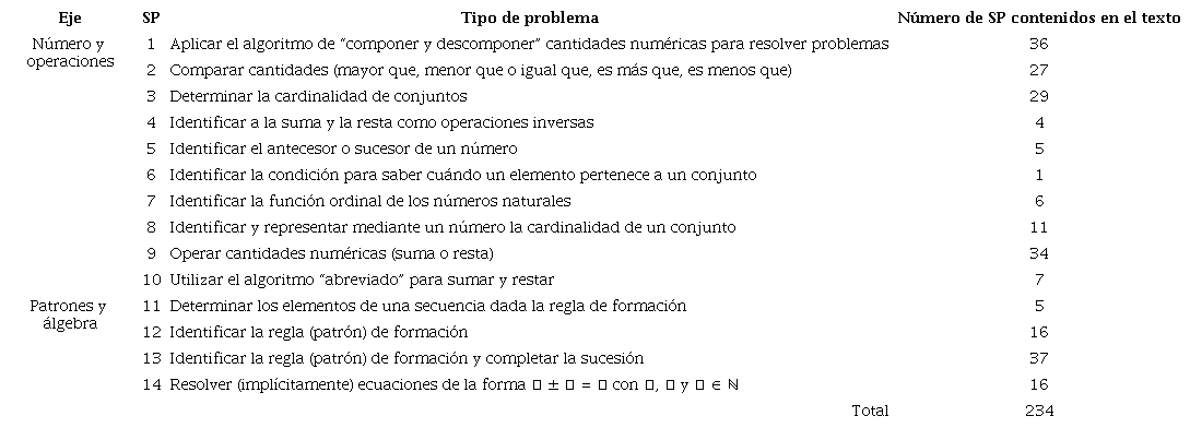 En este nivel se han caracterizado 14 tipos de situaciones-problema (rotuladas como SP) asociados a prácticas matemáticas promotoras del RAE donde cada una de estas prácticas se vinculan a un solo Nivel de Algebrización. La tabla 2 presenta, en la primera columna, los ejes temáticos de interés (Nyo, Pya) de la asignatura Matemática; en la segunda, se asigna un número a cada SP del libro de texto de 1º básico; en la tercera, las tipologías de problemas y, en la cuarta, el número de SP presentes en el libro de texto.