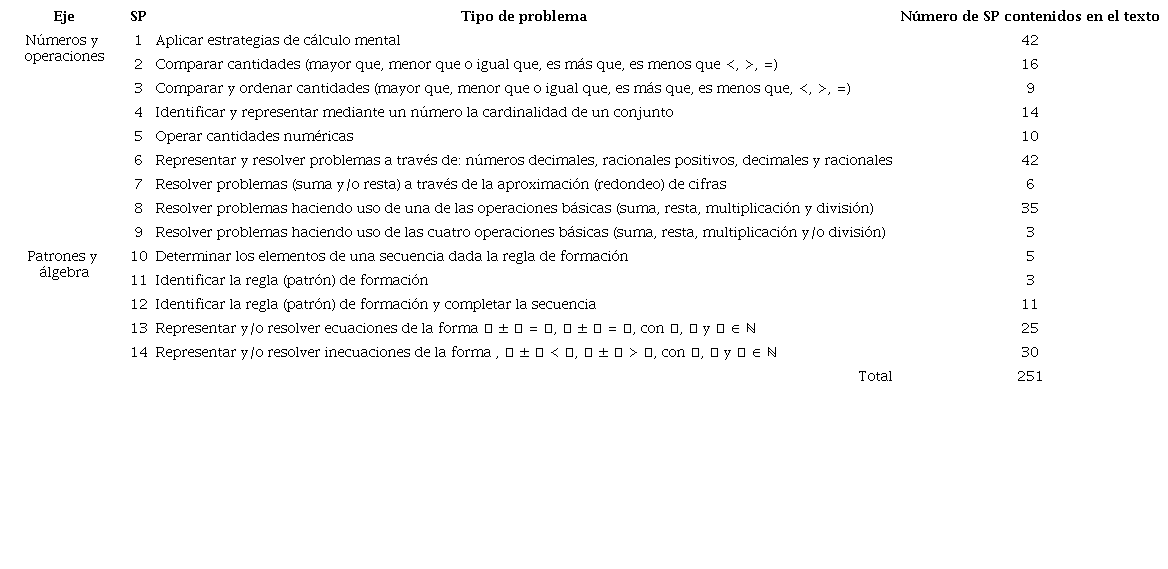 Para efectos metodológicos, este trabajo adopta el modelo de Niveles de Algebrización (Godino et al., 2014) como herramienta de análisis. El análisis de los textos se desarrolla en las siguientes fases: 1) estudio preliminar y selección de los problemas asociados a los ejes Números y operaciones (Nyo) y Patrones y álgebra (Pya) del currículo escolar chileno; 2) resolución de los problemas seleccionados y análisis pormenorizado de las prácticas matemáticas de referencia; 3) generación de las categorías de problemas. Se analizan los seis textos del estudiante presentados en la tabla 1.