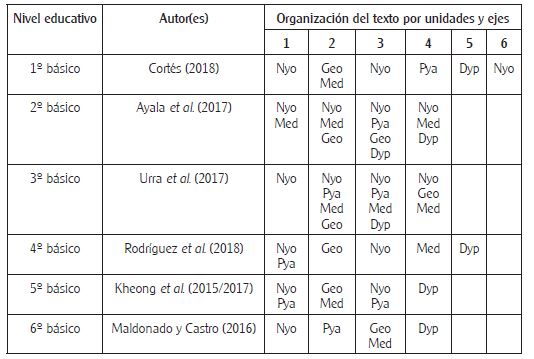 Por otra parte, el MINEDUC pone a disposición de la comunidad educativa actividades complementarias, libros de actividades (cuadernillos de ejercicios), textos oficiales (guía didáctica del docente y texto del estudiante), imágenes, documentos interactivos, presentaciones de videos, entre otros, para cada uno de los niveles de la educación básica. En el caso de los textos del estudiante oficiales, se proponen seis (uno por cada nivel educativo) desde 1° a 6° básico (estudiantes 6 a 12 años), teniendo por objetivo exhibir los contenidos y requerimientos para cada uno de los niveles según lo planteado en las Bases Curriculares. La tabla 1 presenta algunos datos generales sobre los textos del estudiante distribuidos por el MINEDUC para seis de los ocho niveles de la Educación Básica en Chile. Cabe destacar que los textos no se estructuran en el mismo número de unidades y que estas pueden abordar más de un eje cada una.