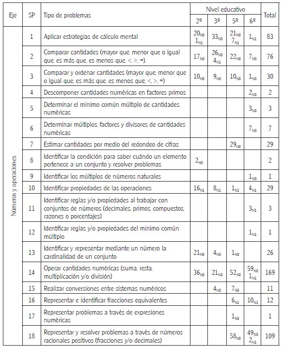En la tabla 3 se presentan en una primera columna los ejes temáticos de interés (Nyo, Pya) de la asignatura Matemática; en la segunda, se asigna un número a cada SP del libro de texto de 4º básico; en la tercera, las tipologías de problema y, en la cuarta, el número de SP presentes en el libro de texto.