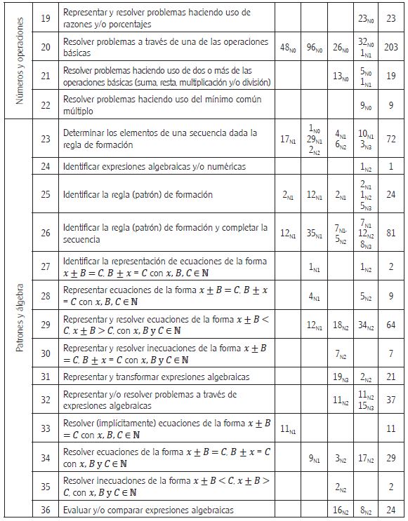 Con respecto a los Niveles proto algebraicos (Niveles 1 y 2), se identifican en ambos ejes. Para el Nivel 1, las prácticas matemáticas vinculadas a tipos de problemas en el eje Nyo versan sobre el trabajo con propiedades de los números y operaciones (por ejemplo, aplicar e identificar las propiedades del 0 y 1 en las operaciones de multiplicación y división, o aplicar las propiedades asociativa y distributiva para calcular productos), y además se identifica la noción de equivalencia numérica (fracciones equivalentes). Para el eje Pya, las tareas consisten en identificar patrones, principalmente numéricos, y completar secuencias numéricas (términos muy próximos al último elemento dado de la secuencia).