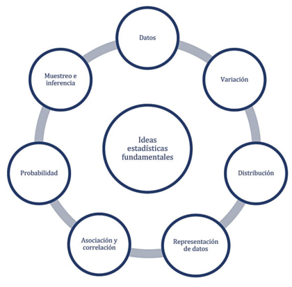 Con este propósito en mente, encontramos que Burrill y Biehler (2011), a partir del análisis de cuatro perspectivas respecto de la enseñanza de la estadística (un marco para el pensamiento estadístico, la estadística como un proceso diferente de las matemáticas, la alfabetización estadística, y la enseñanza estocástica), de los criterios de Heymann (2003) para las ideas fundamentales en matemáticas, y los criterios de Heitele (1975) para las ideas fundamentales en estocástica, proponen un conjunto de ideas estadísticas fundamentales (figura 1 ) que permiten “una comprensión más profunda a lo largo del tiempo a medida que los estudiantes maduran en su conocimiento de estadística” (Burrill y Biehler, 2011, p. 62) y que todo estudiante debería comprender al finalizar la Educación Secundaria.