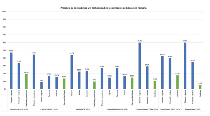 En el caso de la Educación Primaria, el panorama es un poco más alentador, pues en los currículos de Estados Unidos (NCTM, 2003), España, Nueva Zelanda y Chile se observa la presencia de la estadística y la probabilidad lo que favorece el brindar ciertas oportunidades de aprendizaje a los estudiantes de esta etapa para desarrollar de manera gradual y continua la alfabetización estadística y probabilística desde los primeros años de Educación Primaria. No obstante, su presencia es aun muy limitada en relación con la presencia de los restantes ejes temáticos, pues el número de indicadores de contenido u objetivos de aprendizaje destinados a temas de estadística y probabilidad no logran superar el 19% de presencia en el mejor de los casos. Nos encontramos ante currículos desbalanceados en cuanto a la manera de distribuir los distintos ejes temáticos, currículos que dan gran énfasis, por ejemplo, a las ideas y conceptos vinculadas a la numeración y el cálculo. Por otro lado, se observa que en los currículos de Singapur y Estados Unidos (CCSSM, 2010), el estudio de la probabilidad es postergado para la etapa de Educación Secundaria (13 a 18 años).