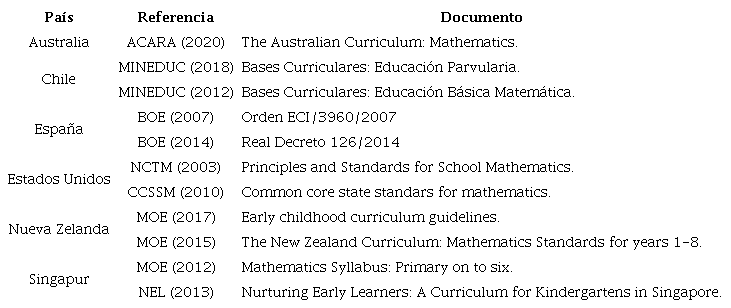 La muestra se encuentra conformada por las propuestas curriculares para la Educación Matemática en Educación Infantil y Educación Primaria que se indican en la tabla 1. Respecto de las unidades de análisis, estas corresponden a los ejes temáticos vinculados al estudio de la estadística y la probabilidad en el currículo de Educación Infantil y Educación Primaria, sus respectivos descriptores y objetivos de aprendizaje.