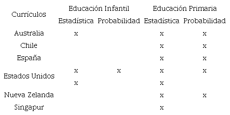 A nivel general y a partir del análisis de las orientaciones curriculares de Australia, Chile, España, Estados Unidos, Nueva Zelanda y Singapur, se observa que la presencia del estudio de nociones y conceptos vinculados a estadística y probabilidad no se da de manera continua en los currículos de infantil y primaria de todos los países considerados en este estudio (tabla 2).