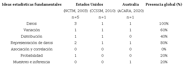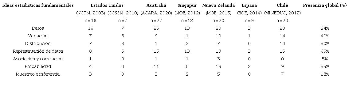 Con el propósito de identificar cuáles son las ideas estadísticas fundamentales que están presentes en las orientaciones curriculares consideradas en este estudio, se realizó un análisis transversal de las propuestas curriculares que consideró los indicadores de contenido u objetivos de aprendizaje vinculados a estadística y probabilidad para cada uno de los cursos que conforman el nivel educativo en cuestión. Se consideraron aquellos rasgos claramente identificables, y que se pueden vincular con las ideas estadísticas fundamentales.